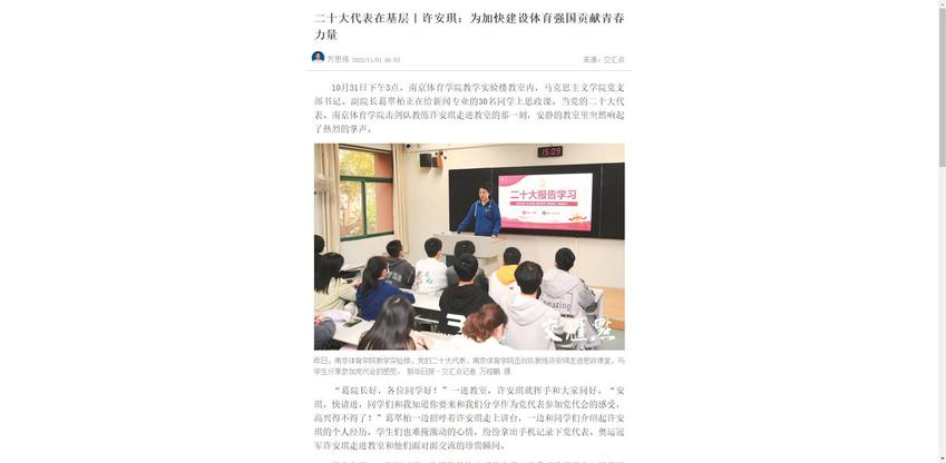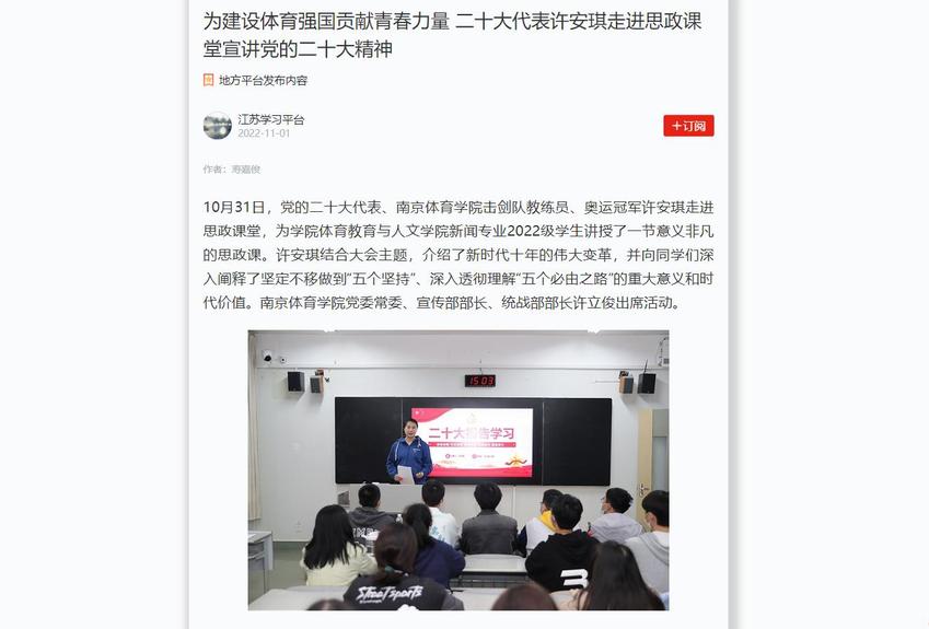 【学习强国·江苏学习平台】为建设体育强国贡献青春力量 二十大代表许安琪走进思政课堂宣讲党的二十大精神