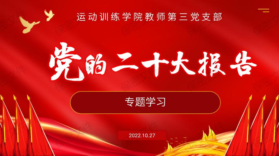 中国共产党第二十次全国代表大会于10月22日在人民大会堂胜利闭幕。学习宣传贯彻好党的二十大报告精神,是当前和今后一段时期的首要政治任务。根据“36365最新线路检测中心传达党的二十大精神暨党委理论学习中心组学习会”精神,以及《运动训练学院党总支关于各党支部组织一次专题学习主题党日活动》要求,运动训练学院党总支教师第三党支部于2022年10月27日以视频会议的方式,开展了“党的二十大报告”专题学习活动。教师第三党支部全体党员参加学习,非党员教师列席学习。会议由支部书记周晓军主持。