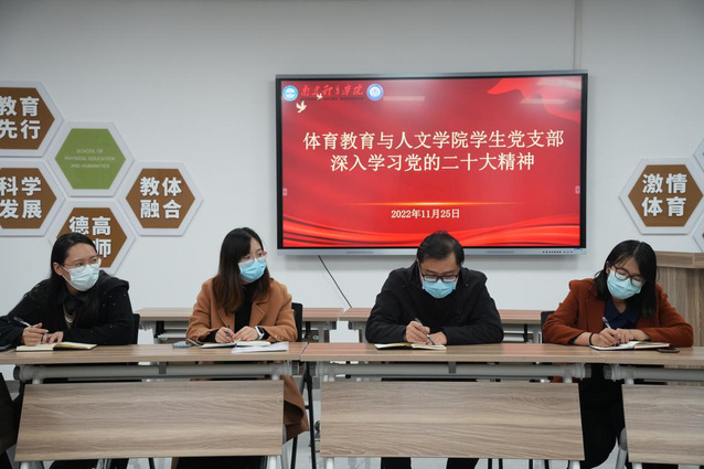 《关于认真学习宣传贯彻党的二十大精神的决定》指出学习宣传党的二十大精神是当前和今后一个时期全党全国的首要政治任务。为深入学习宣传贯彻党的二十大精神,11月25日,体育教育与人文学院学生党支部在教学办公楼220会议室,召开深入学习党的二十大精神学习会,学院党总支副书记卢奎出席会议,学院各年级辅导员、学生骨干和部分党员参会。会议由高强领学。