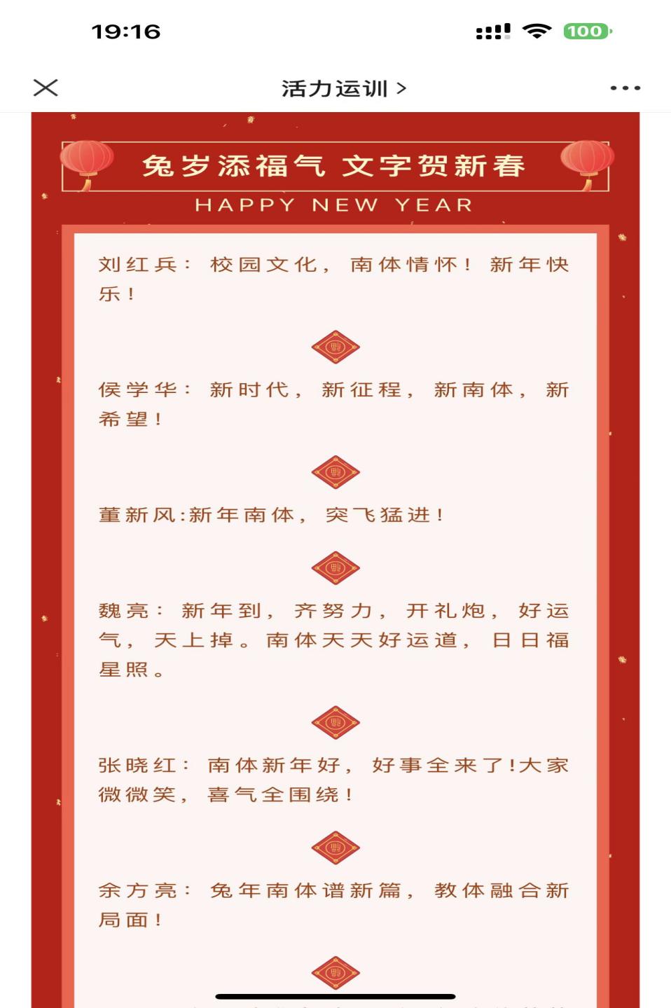 新春新气象,新年新希望。在新春佳节来临之际,运动训练学院于春节假期举办了“欢乐迎新春,祝福满运训”新春祝福征集活动,学院全体师生通过多种形式送上新年祝福。