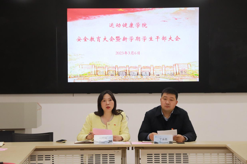 3月6日中午,运动健康学院在图书馆第二报告厅召开安全教育大会暨新学期学生干部大会。学院党总支书记丁永亮、副书记阚妮妮出席会议。学工办主任王菁菁、团委副书记魏晓民、全体学生党员和团学干部参加了本次会议。会议由阚妮妮主持。