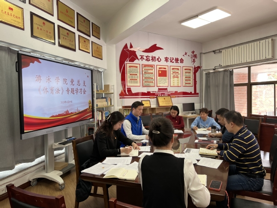 3月29日中午,游泳学院党总支在跳水花游馆二楼会议室召开《体育法》专题学习会。游泳学院党总支副书记(主持工作)骆晓娟进行了领学,全体管理干部参加了学习。