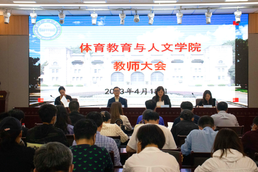 为学习贯彻习近平新时代中国特色社会主义思想主题教育,确保学院全年各项工作目标任务落到实处、如期完成,4月18日下午,体育教育与人文学院召开全院教师大会传达学校相关会议精神并签订年度目标任务书、责任书。会议由体育教育与人文学院院长沈鹤军主持,学院党总支书记卢奎、副书记喻菊、副院长康晓磊出席会议并讲话,全体教师参加了会议。