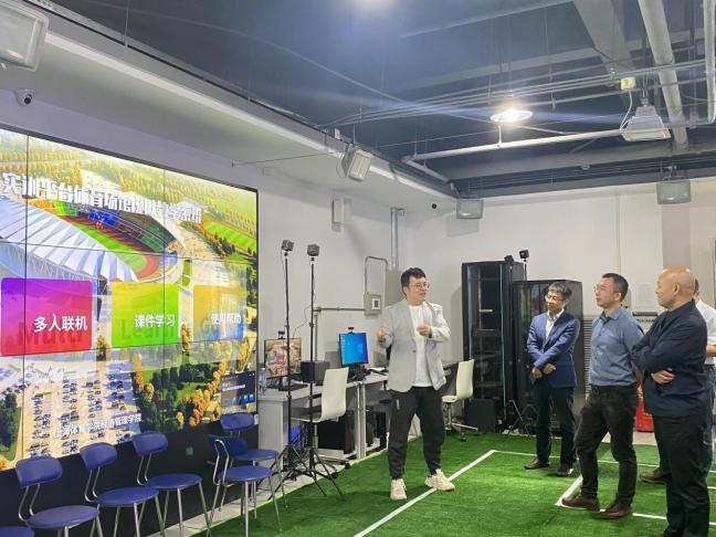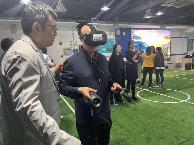 座谈会的尾声,与会双方一起来到上体经济管理学院足球机器人实验室进行参观。实验室中心负责人徐成龙介绍了实验室的基本情况和现有的设施设备。老师们体验了体育场馆VR实景互动,机器人足球队成员们给大家演示了机器人足球运动的精彩表演,王龙飞和球员“梅西”体验了射门的精彩瞬间。
