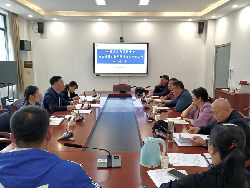 4月26日下午,校学科建设办公室、体育产业与休闲学院在办公楼101会议室召开自主设置二级学科硕士点申报工作研讨会。学科建设办公室主任郭修金,体育产业与休闲学院党总支书记王进、院长王龙飞、副院长柏景岚以及相关负责人参会,会议由王龙飞主持。