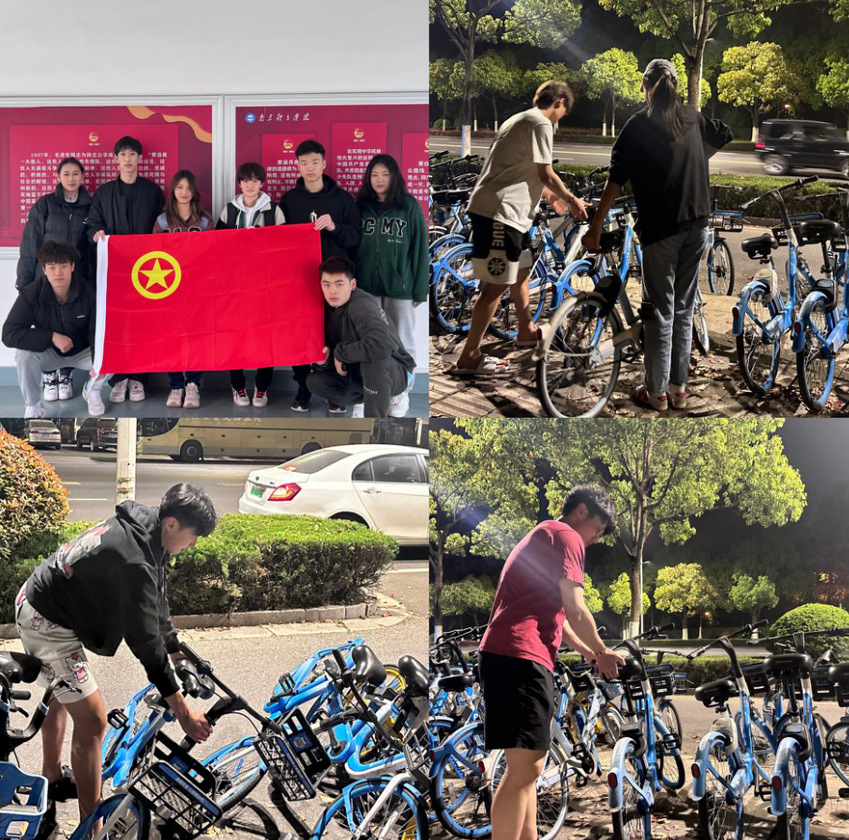 团员青年们在整理仙林校区西门外散乱的共享单车
