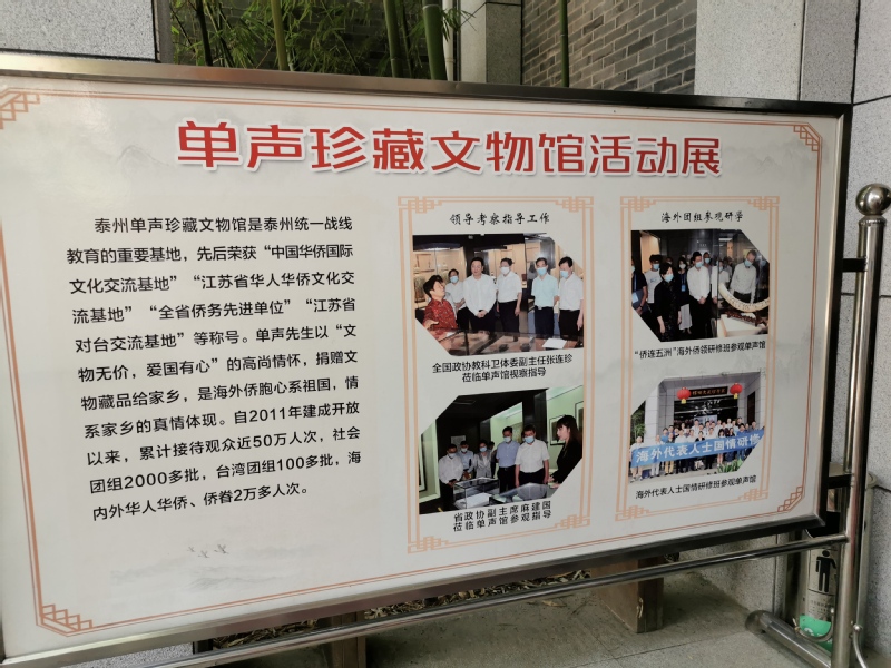 单声,1929年6月出生于上海,祖籍江苏泰州海陵,先后任全英华人华侨中国统一促进会总会长、中国侨联特聘顾问、中国和平统一促进会理事等职务,是著名的爱国主义侨领、法学博士,也是我国制定《反分裂国家法》立法促统的第一人。单声珍藏文物馆充分展示了单声先生及其家人爱国爱乡的高尚情怀,对提升泰州城市文化内涵,促进文化泰州建设,激励人们报效祖国、建设家乡,具有积极的推动作用。