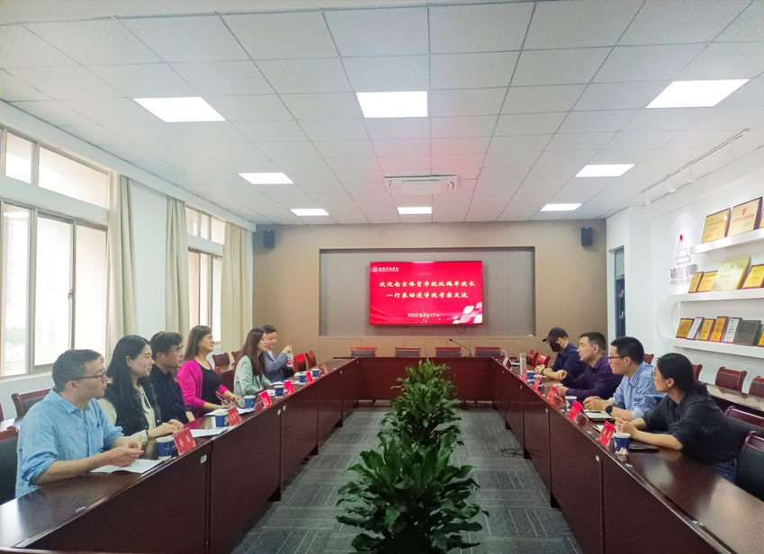 为更好的促进本科教育改革发展,构建产教融合型人才培养体系,5月17日下午,体育教育与人文学院院长沈鹤军、副院长康晓磊、体育传媒系主任李劭强、副主任张腾霄及部分系部教师一行赴金陵科技学院动漫学院调研交流,动漫学院院长王贤波、副书记匡才远、视觉传达系主任蔡晓军、实验中心主任钱晨参加座谈。