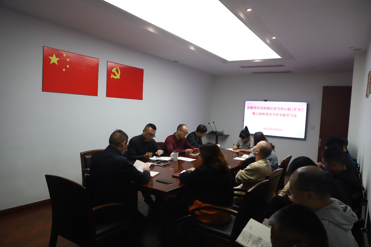 5月22日上午,后勤党总支部召开理论学习中心组(扩大)暨主题教育读书班专题学习会,后勤处全体科以上干部参加会议。
