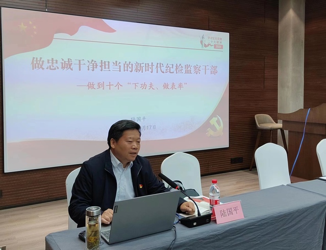 邀请南通大学党委常委、纪委书记、派驻监察专员陆国平为大家作题为《做忠诚干净担当的新时代纪检监察干部》的专题讲座。陆书记结合党的二十大精神从忠诚、干净、担当等三个维度,从在提高政治站位上下功夫、做表率,在加强理论武装上下功夫、做表率,在强化宗旨意识上下功夫、做表率,在担当时代责任上下功夫、做表率,在练就过硬本领上下功夫、做表率,在发扬斗争精神上下功夫、做表率,在勇于自我革命上下功夫、做表率,从在改进工作作风上下功夫、做表率,在严守纪律规矩上下功夫、做表率,在锤炼道德修为上下功夫、做表率等十个方面对如何做忠诚干净担当的新时代纪检监察干部进行全面系统地阐述。陆书记的讲课深入浅出、图文并茂、案例翔实,既有理论讲解,又有管用经验,对如何成长为一名忠诚干净担当的新时代纪检监察干部有积极的现实意义和指导作用。