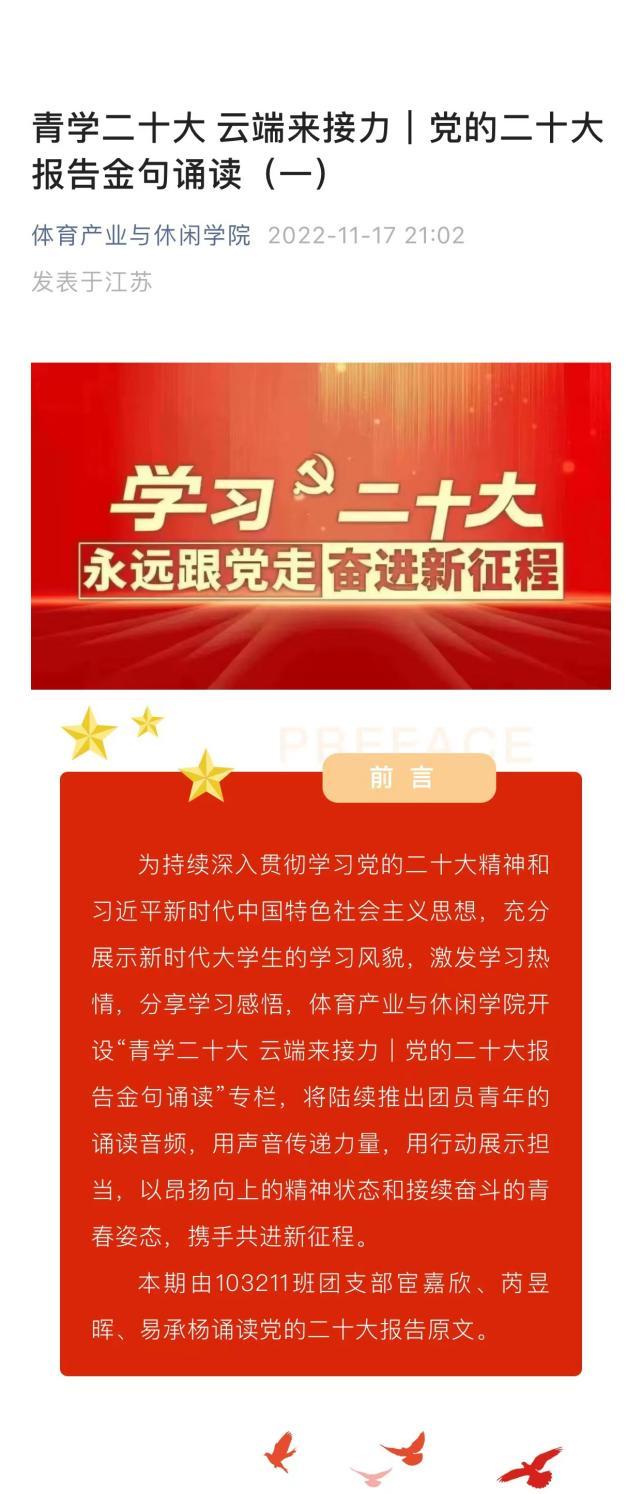 为学习宣传贯彻党的二十大精神,引导广大团员青年深入学习党的二十大报告和新修订的《党章》,认真领悟党的二十大提出的新思想新论断、作出的新部署新要求,连日来,体育产业与休闲学院团委积极开展形式多样的学习宣传活动,用大会精神统一思想、凝聚意志,踔厉奋发、勇毅前行,真正把学习成果转化为实际行动和工作成效。