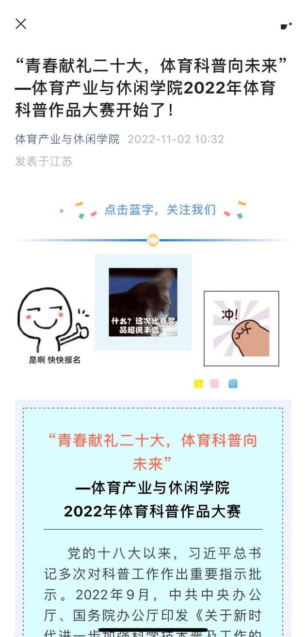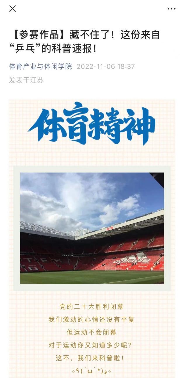 为引导广大团员青年全面学、深刻悟、用心做,把党的二十大精神落到实处、融入心中,学院开展了“青学二十大 云端来接力”——党的二十大报告金句诵读、“青春献礼二十大 体育科普向未来”——2022年体育科普作品比赛等活动;各团支部结合党的二十大精神和专业特色,开展了“抄党章 忆初心”主题团日活动、“学习二十大 奋进新征程”知识竞赛活动等,通过丰富多彩的活动形式,营造浓厚的学习氛围,持续掀起学习宣传贯彻党的二十大精神热潮。