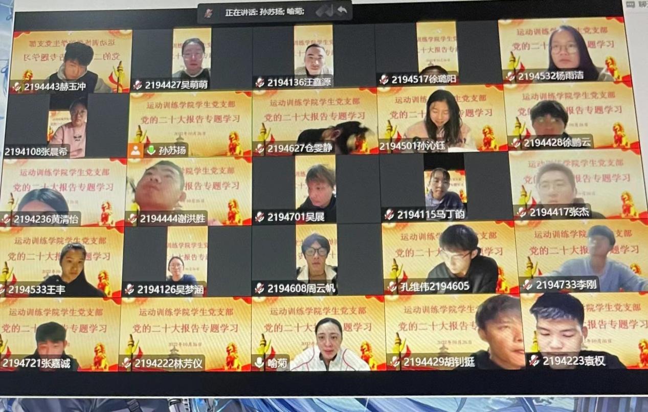 凝心聚力擘画新蓝图,团结奋进谱写新篇章。为深入学习宣传贯彻党的二十大报告精神,10月26日晚,运动训练学院党总支学生党支部在线开展党的二十大报告专题学习,推动党的二十大精神学习宣传工作,按照校党委要求和学院党总支部署,迅速掀起学习党的二十大报告精神热潮。学院党总支副书记、学生党支部书记喻菊主持学习。学生支部全体党员参加学习。