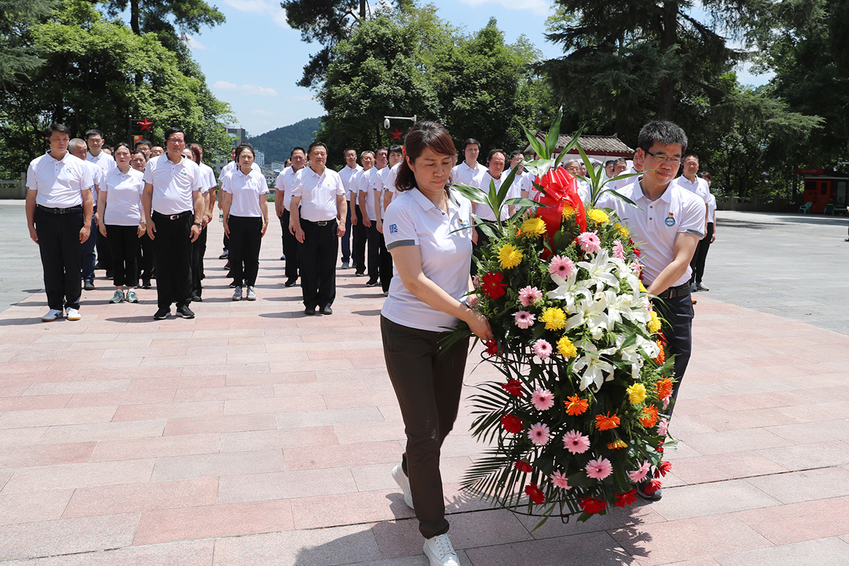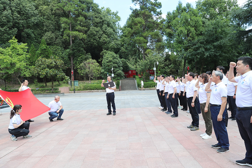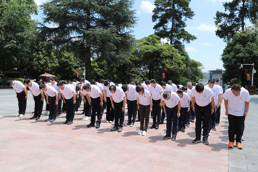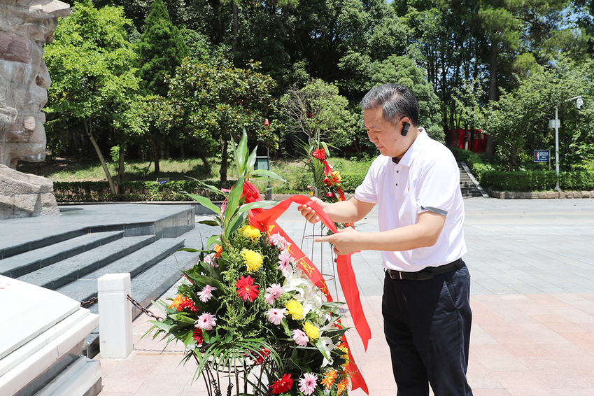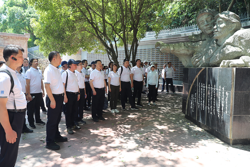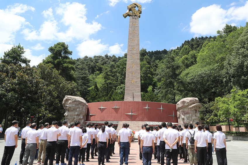 在红军山烈士陵园,培训班全体学员向红军烈士纪念碑敬献花篮。校党委副书记兰亚明和校党委常委、纪委书记、派驻监察专员潘林珍手抬花篮,目光坚毅,缓步向前,稳稳将花篮放在烈士纪念碑前。朱传耿上前整理花篮缎带,全体学员默哀并三鞠躬,深切缅怀为中国革命事业英勇献身的红军烈士。随后,面对鲜艳的党旗,朱传耿带领全体学员一起重温入党誓词,庄严而坚定的宣誓声响彻红军山。在讲解员带领下,大家依次参观学习了红军长征浮雕、红三军团参谋长邓萍墓、邓萍牺牲时的雕塑、红军英烈墙、红军坟、“红军坟”纪念铜像,深入了解感受了红军将士不怕牺牲、英勇斗争的伟大精神。