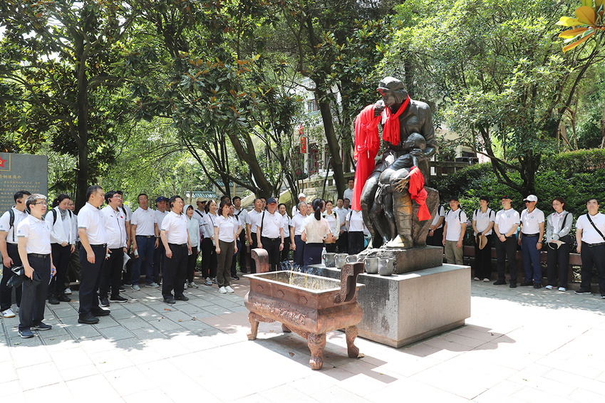 在“红军坟”纪念铜像前参观学习