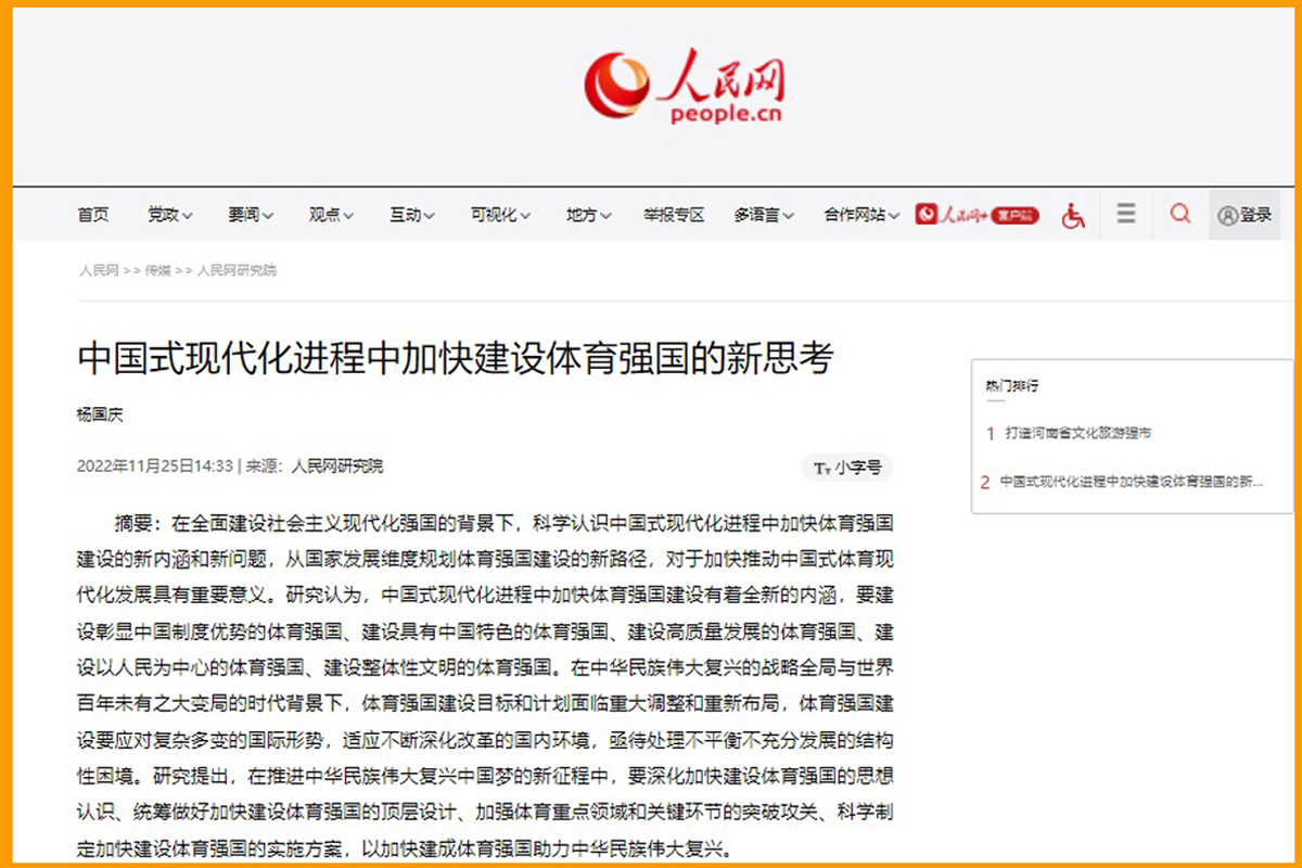 人民网全文转发校长杨国庆署名文章《中国式现代化进程中加快建设体育强国的新思考》