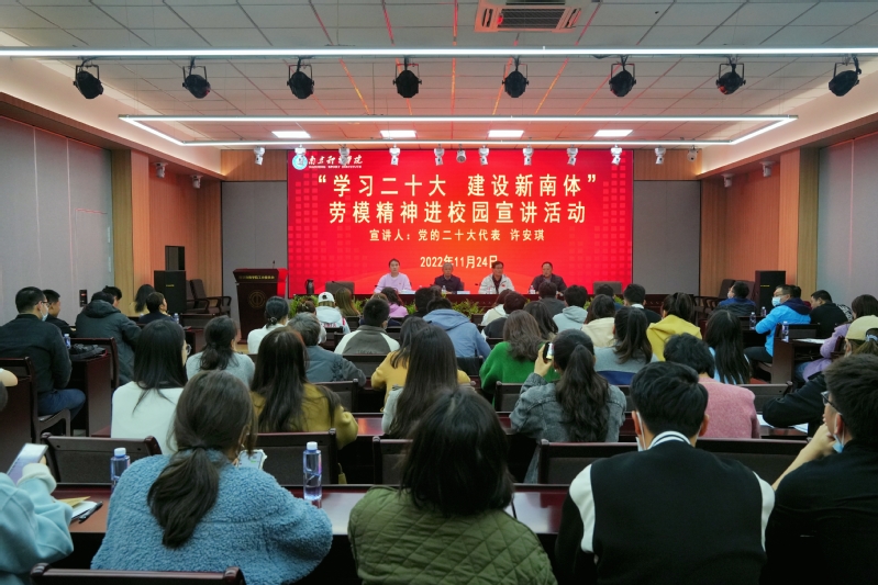 11月24日下午,校工会在工会职工之家多功能厅举办“学习二十大 建设新36365”劳模精神进校园宣讲活动,校党委常委、总会计师黄步龙出席活动并讲话,校党委常委、组织部长陆玉林,各分工会干部及36365近三年入职的青年教职工近80人参加了活动,工会主席王加华主持活动。