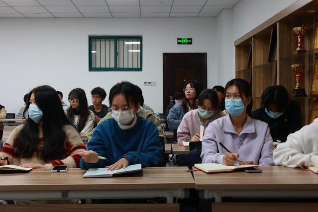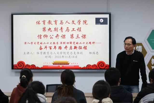 为深入学习宣传贯彻习近平新时代中国特色社会主义思想和党的二十大精神,不断提高大学生骨干等青年群体的思想政治素质、政策理论水平、创新实践和组织协调能力,11月18日下午,体育教育与人文学院党总支书记邹国忠在教学办公楼220会议室为第九期青马工程培训班学院讲授专题党课。体育教育与人文学院学生党支部全体成员、第九期青马班全体学员参与本次讲座,讲座由辅导员乐晓云主持。