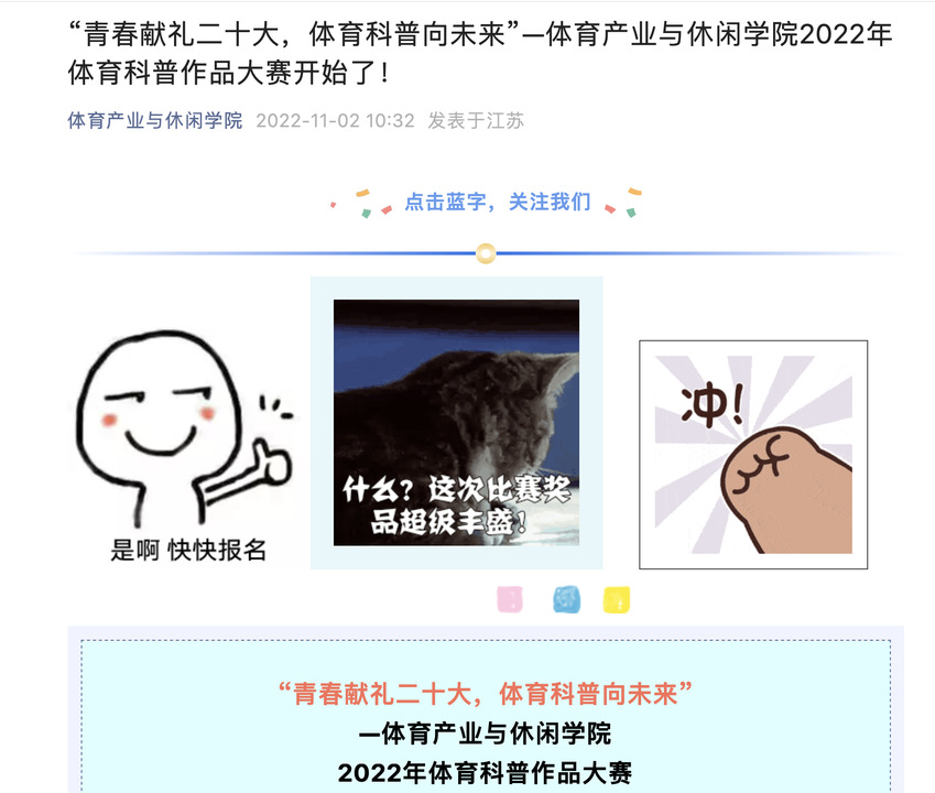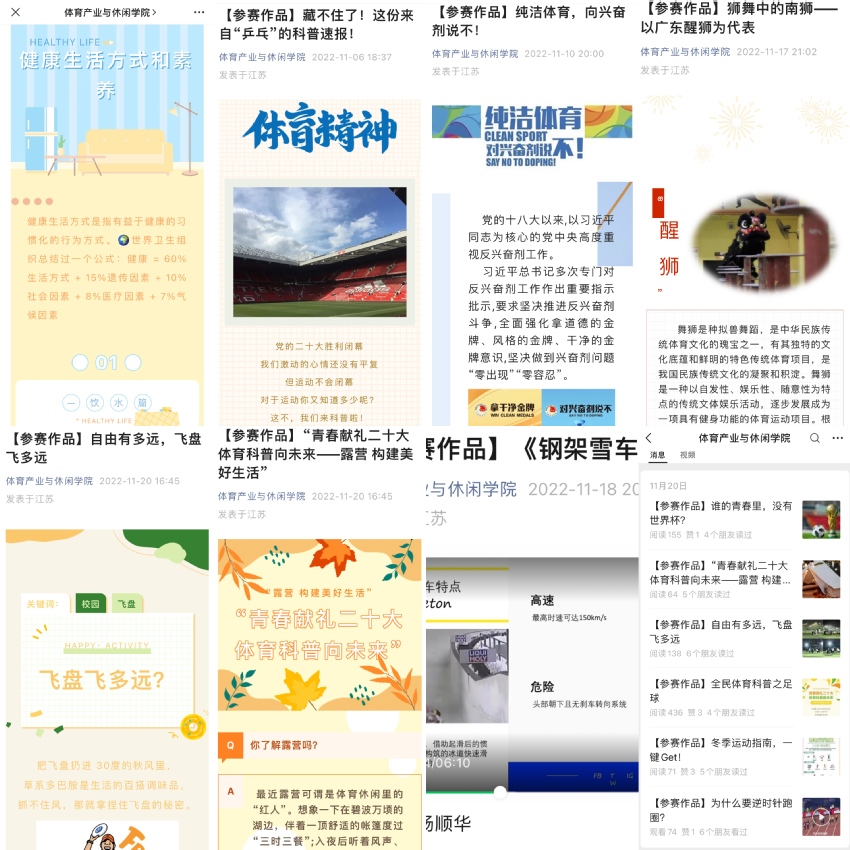 为深入贯彻党的二十大精神,广泛普及体育科学知识,促进体育科技创新发展,体育产业与休闲学院于2022年11月举办了“青春献礼二十大,体育科普向未来”为主题的体育科普作品大赛。比赛分为“体育科普微信推文”以及“体育科普微视频”两个赛道。分别设置一、二、三等奖、优秀奖,以及最佳创意奖、最高人气奖、最佳标题奖、最佳排版奖、最佳男、女主角等单项奖,同时评选数名优秀指导教师。