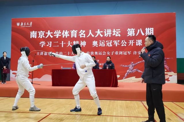 张蕾、王森、陈滔滔三位教练与许安琪一起回答现场学生提问,对击剑运动的起源、礼仪、类别、器材、规则等进行讲解,现场气氛热烈,掌声频频。江苏击剑队运动员身着比赛装备,在三位教练的解说下,为同学们演示了佩剑、花剑、重剑的基本技战术,并进行了实战对抗展示。