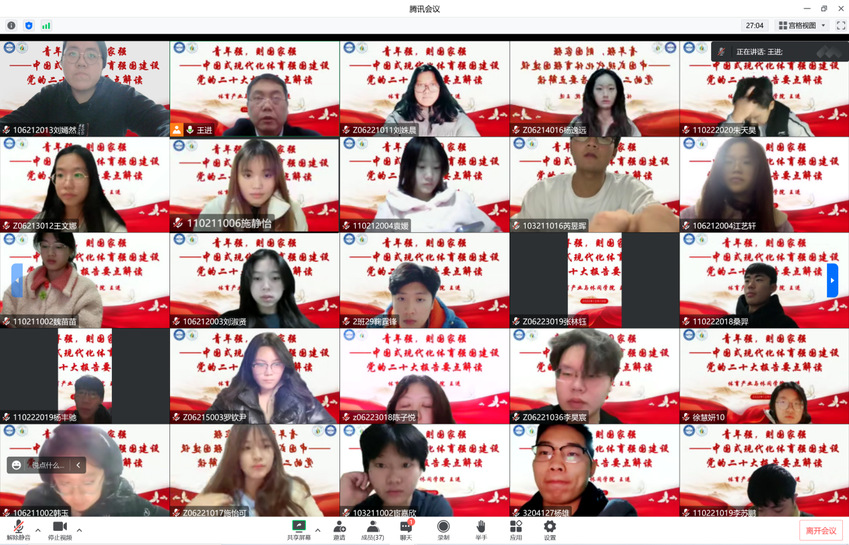 王进首先深入解读党的二十大报告中有关体育的重要论述,指出中国式现代化体育道路是体育强国建设的必由之路,并从整体把握、重点突出和联系实际三个方面对体育院校大学生如何学好党的二十大报告进行解读,引导大家明确自身肩负的历史使命,为体育强国建设贡献青春力量。最后,他希望同学们以“体育人”的身份深入理解党的二十大报告,在今后的学习生活中立志做一名有理想、敢担当、能吃苦、肯奋斗的新时代好青年。