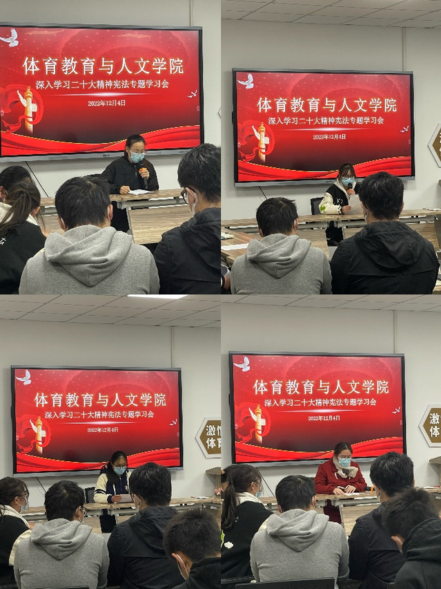 2022年是我国现行宪法颁布施行的四十周年,体育教育与人文学院把学习宣传贯彻党的二十大精神,推动全面做好宪法宣传教育工作作为开展教育教学的重要内容,深入做好学生思想政治教育引领,引导学生们将党的精神铭刻于心,让法治信仰在校内蓬勃生长,促进学院全体师生一起学法、知法、尊法、守法、用法,为建设法治校园贡献力量。