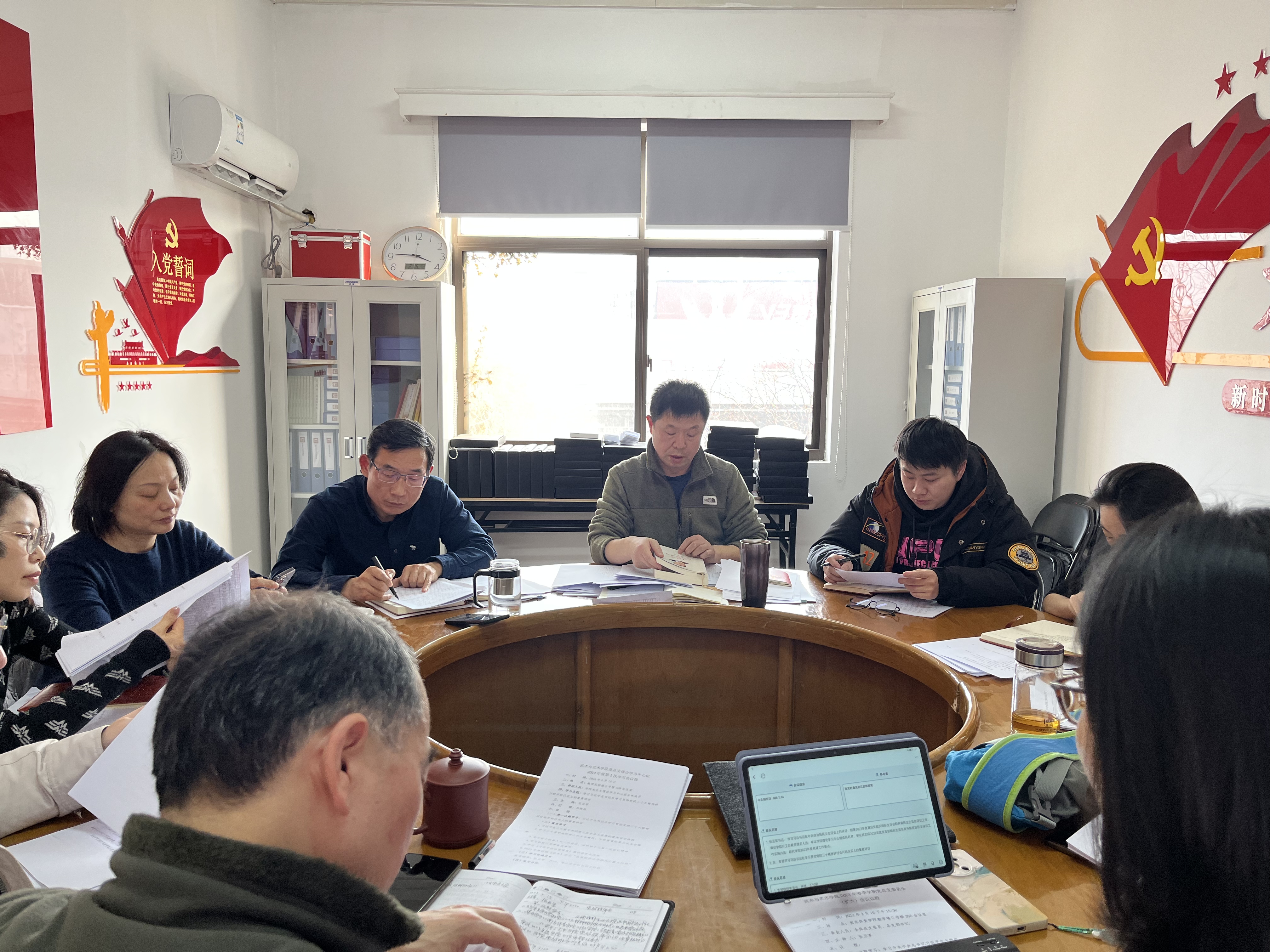 2月16日下午,武术与艺术学院党总支在教学实验楼二号楼308会议室召开2023年度理论学习中心组第一次集体学习会,重点学习习近平总书记在新进中央委员会的委员、候补委员和省部级主要领导干部学习贯彻习近平新时代中国特色社会主义思想和党的二十大精神研讨班开班式上的重要讲话精神,以及习近平总书记近期系列重要讲话。全体理论学习中心组成员参加学习。学院党总支书记张亚军主持集体学习会。