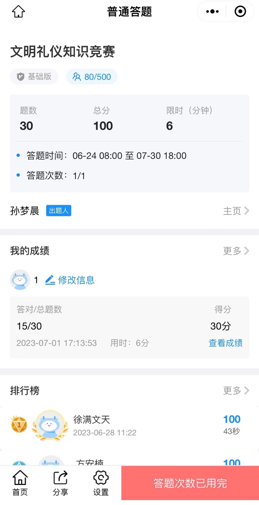 本次文明礼仪知识线上竞答在乒羽学院运动员中反响热烈,全院累积参与人数达到80人。根据答题规则,本次活动共决出一等奖3名、二等奖5名、三等奖7名。活动结束后,参与运动员纷纷表示,通过此次专题教育和线上竞答,进一步强化了运动员的文明礼仪知识,规范了文明礼仪行为,使运动员养成了讲文明、知礼仪、重诚信的良好习惯。