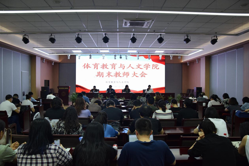 7月7日上午,体育教育与人文学院召开期末教师大会。体育教育与人文学院党总支书记卢奎、院长沈鹤军、党总支副书记喻菊、副院长康晓磊出席会议,学院全体教师参加会议。会议由沈鹤军主持。