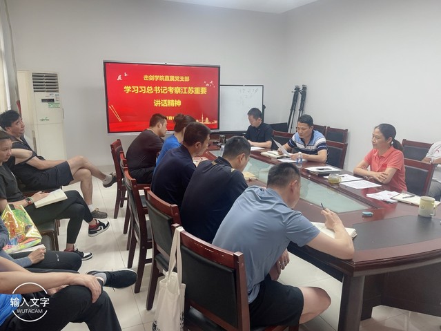 7月17日上午,击剑学院直属党支部召开党员大会,认真学习习近平总书记在江苏考察时的重要讲话精神。击剑学院直属党支部书记朱小兰带头领学,宣讲阐释习近平总书记在江苏考察时的重要讲话的意义和主要内容,并结合击剑学院工作实际,与大家分享自己学习的心得体会。会议由击剑学院副院长孙海平主持,全体党员干部参加了学习。