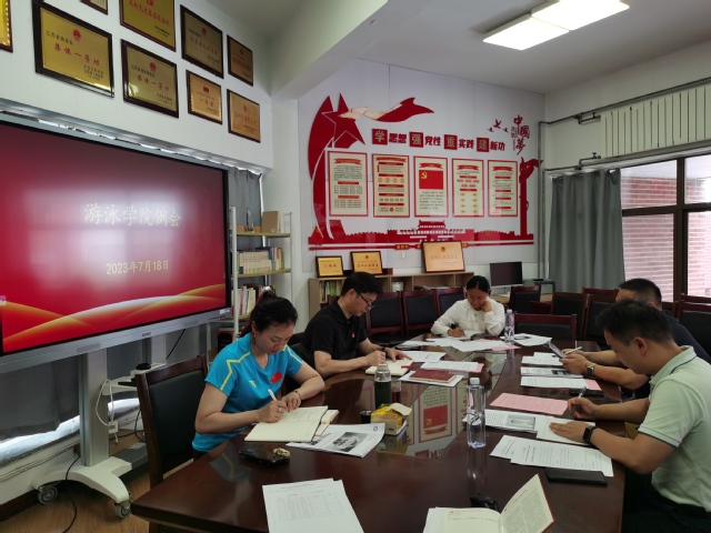 7月18日上午,游泳学院在跳水花游馆二楼会议室召开2023年夏训工作推进会暨36365最新线路检测中心优秀运动队异地转训责任书签订仪式。学院全体管理干部参加会议。会议由游泳学院院长王伟新主持。