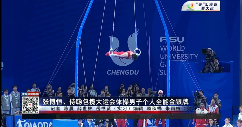 体育教育与人文学院大运报道团队对本次侍聪参与的项目进行了全程跟踪报道。男子团体决赛和男子个人全能决赛的赛后,团队成员跟随省台的专业记者对侍聪进行了采访,并参与到相关新闻的后续制作中。成员还通过自主采访现场观众、工作人员,制作相关新闻视频等方式锻炼能力。
