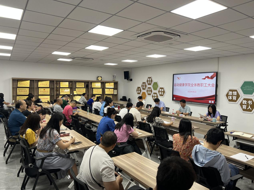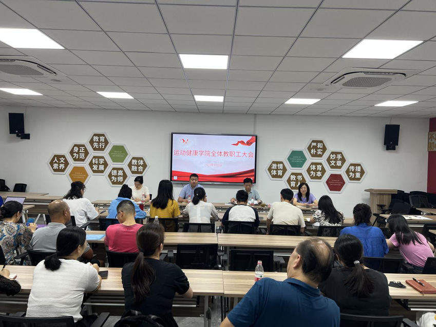 春华秋实又一载,砥砺奋进续新篇。9月2日上午,运动健康学院2023-2024学年秋季新学期全体教职工大会在教学办公楼220会议室召开,学院党总支书记丁永亮、院长汤强、党总支副书记阚妮妮、副院长赵彦及全体教职工参会。会议由阚妮妮主持。