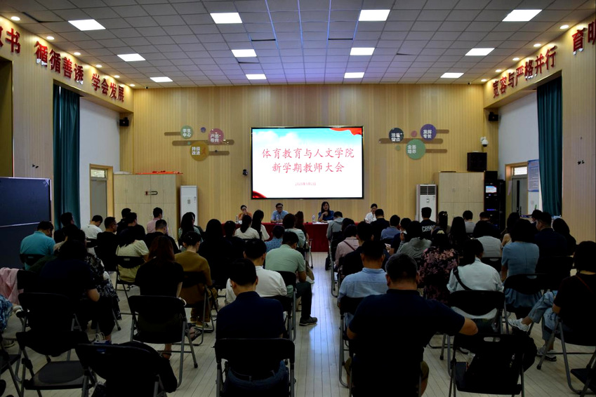 9月2日上午,体育教育与人文学院于东阶召开2023—2024学年秋季新学期教师大会。体育教育与人文学院党总支书记卢奎、院长沈鹤军、党总支副书记喻菊、副院长康晓磊出席会议。学院全体教师参会。会议由院长沈鹤军主持。
