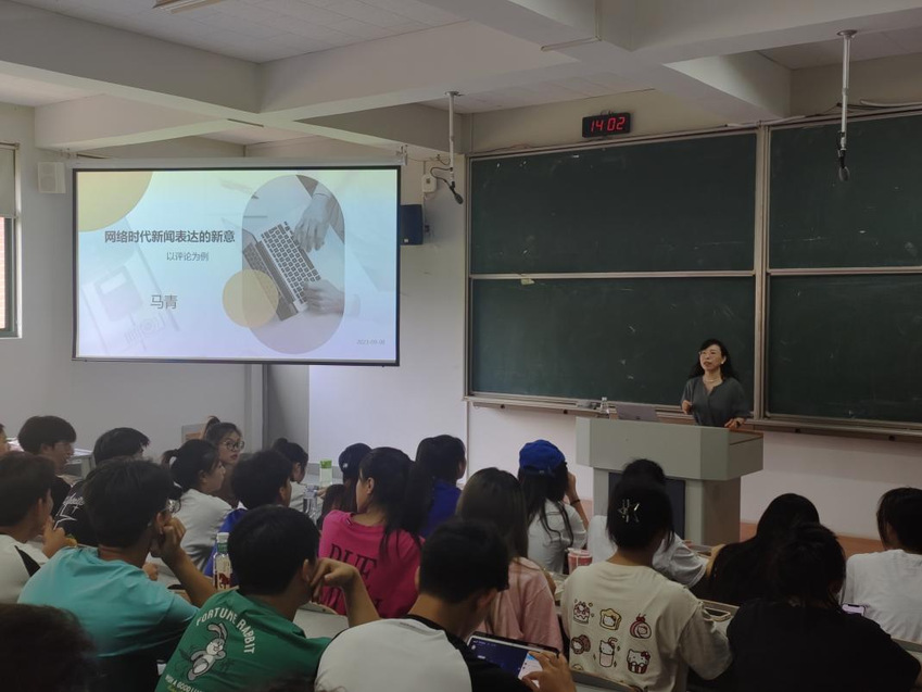为做好学生实习岗前培训工作,提升学生专业能力,9月8日下午,体育教育与人文学院体育传媒系邀请南京广电集团融媒体中心新闻主播、南京广播电视首席主持人马青作“网络时代新闻表达的新意——以评论为例”主题讲座。讲座由体育传媒系教师李金宝主持,体育教育与人文学院新闻专业20级全体学生参加讲座。