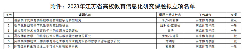 近日,江苏省高等教育信息化研究会公布了2023年江苏省高校教育信息化研究课题拟立项名单,共评审出重点课题49项,一般课题95项,合计立项144项。363656项课题获得立项,其中重点课题1项,一般课题5项。