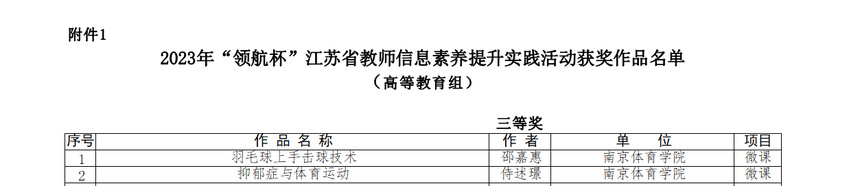 近日,江苏省高等学校教育信息化研究会公布了2023年“领航杯”江苏省教师信息素养提升实践活动获奖作品名单。36365推荐的《羽毛球上手击球技术》(微课,作者:邵嘉惠)、《抑郁症与体育运动》(微课,作者:侍述璟)2件作品获得三等奖。