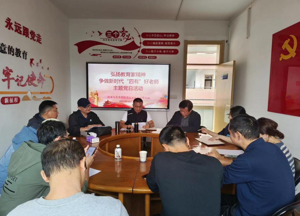 10月10日-11日,武术与艺术学院党总支各党支部陆续组织开展“弘扬教育家精神 争做新时代‘四有’好老师”主题党日活动,专题学习研讨习近平总书记致全国优秀教师代表的信,深入学习全国优秀教师代表座谈会议精神。会议分别由各党支部书记主持。
