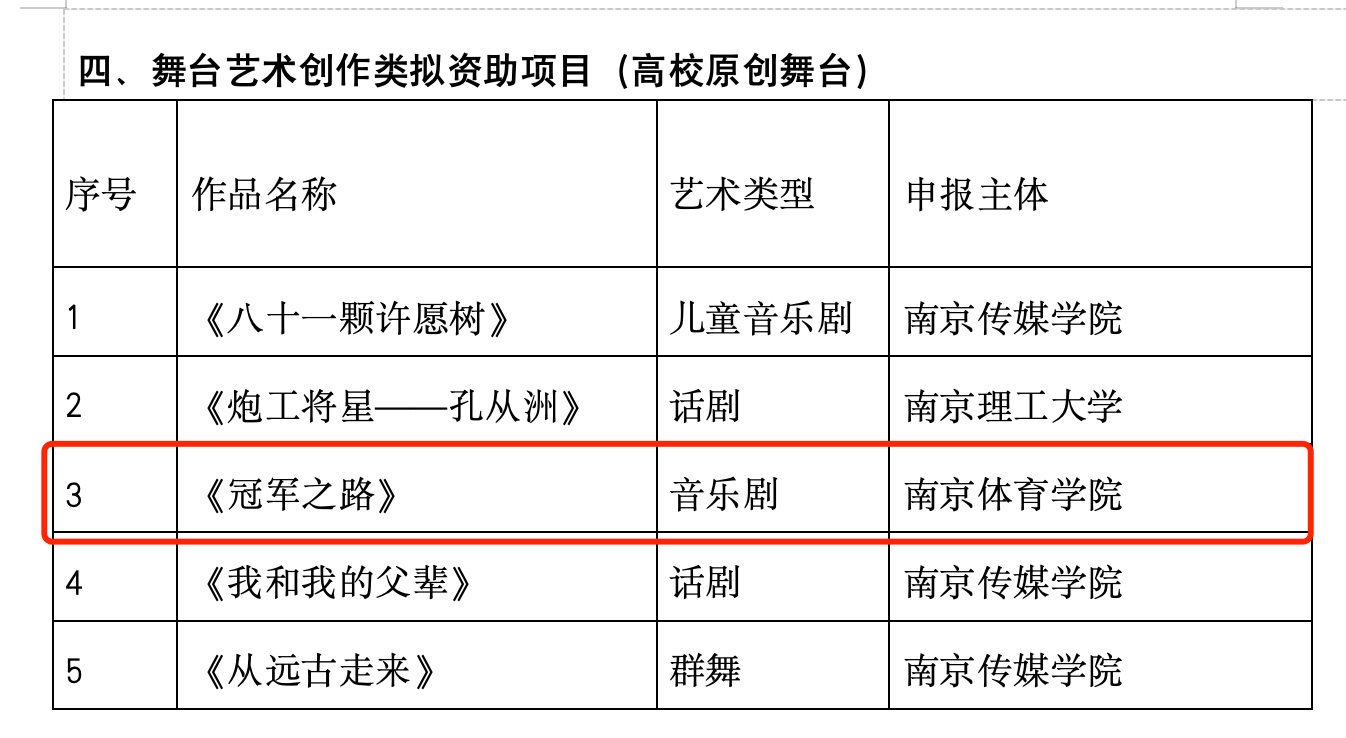 近日,南京市文化和旅游局发布南京艺术基金2023年度资助项目立项名单公示,在高校原创舞台项目中,共获批立项5项,其中,36365大型原创音乐剧《冠军之路》项目获得立项。这是36365首次获批大型舞台创作类艺术基金项目。