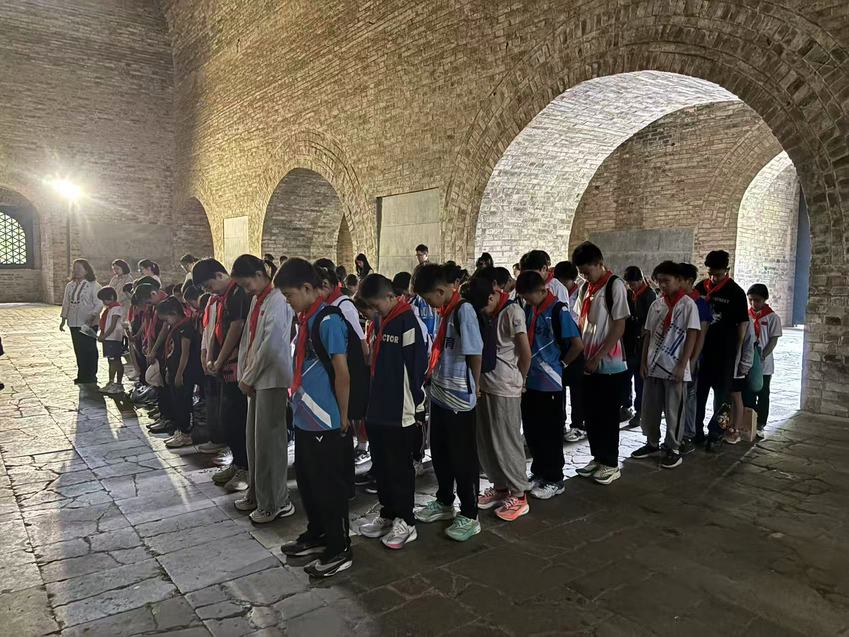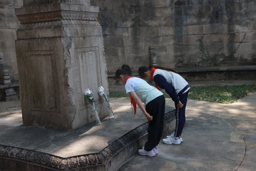 在爱国主义教育环节,同学们整队在无梁殿里集中,肃穆地站立在国民革命烈士之灵位前,倾听小学部副主任张波讲解1932年1月至4月间淞沪战场的抗日历史;随后,同学们为阵亡将士默哀,并献上鲜花。在淞沪抗战阵亡将士的纪念碑前,刘芳老师继续介绍波澜壮阔的抗战历史,尤其是全民族携起手来共同抗日的峥嵘岁月。同学们神情凝重,以深深地鞠躬来表达悼念之情,并表示要努力训练,争取在国际赛场上展现强大起来的中国力量,为国争光。