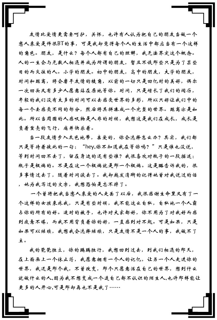 其实准确来讲,是你跟我比较熟。我是直到中考,就是让我感觉到“活着是一件多不要脸的事”的那次考试,监考老师告诉我选择题涂卡不能用水笔而你挺身而出的时候,才真正知道你的名字的。当然说到这儿,你千万不要怪我之前跟你一直是假熟,因为我是觉得,有许多认识并叫得出名字的人不一定是朋友,而有些不一定知道名字的,或者只是偶尔联络的,却可能值得我付出生命以外的一切。比如你。