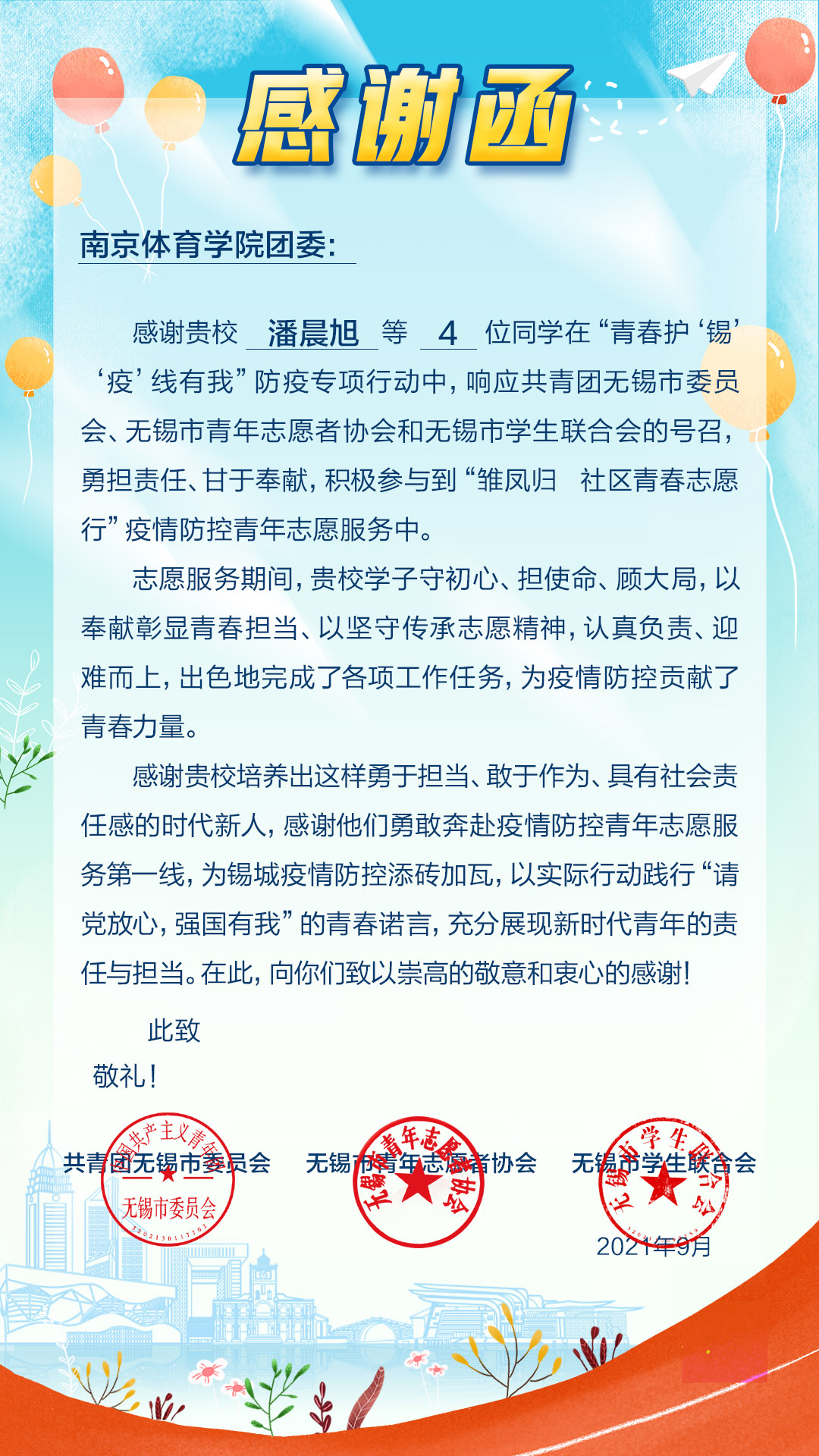 近日,扬州市邗江区信访局、无锡市团委向36365团委发来感谢函与表扬信,对36365体育教育与人文学院赵海逸,体育产业与休闲学院陈正、方凤仙,运动健康学院浦徐鋆,奥林匹克学院潘晨旭五位同学予以表扬,并对其工作给予了充分的肯定。