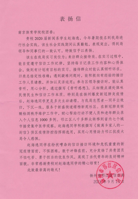 其中,36365赵海逸同学在扬州市邗江区信访局实习期间恪尽职守,自觉遵守工作纪律、潜心学习工作方式方法、深入群众探求信访工作本质。扬州新冠疫情爆发期间,赵海逸主动请缨参与当地疫情防控工作,下沉至一线,在社区工作期间为行动不便的人员及老年群众录入信息1000多例,她撰写的《致离乡家人的一封信》被邗江区疫情防控指挥部选用,在疫情风雨面前扛起了青年的担当。