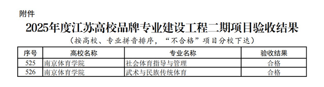 近日,江苏省教育厅公布了2025年度江苏高校品牌专业建设工程二期项目验收结果,363652022年立项的第三批省级品牌专业武术与民族传统体育、社会体育指导与管理2个专业顺利通过验收。