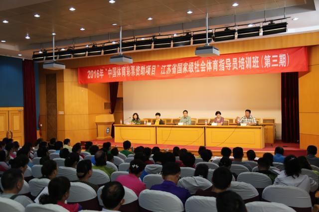 9月20日8:30,2016年“中国体育彩票资助项目”江苏省国家级社会体育指导员培训班(第三期)开班仪式在院报告厅举行。院党委书记陈国祥教授、省体育局群体处副处长吉春英同志、继续教育部主任李勇勤教授、运动营养与健康专家张蕴琨教授、继续教育部副主任李英及全体工作人员和来自南京、无锡、徐州、盐城、扬州、淮安六市的近100位学员出席了开班仪式。开班仪式由继续教育部主任李勇勤教授主持。
