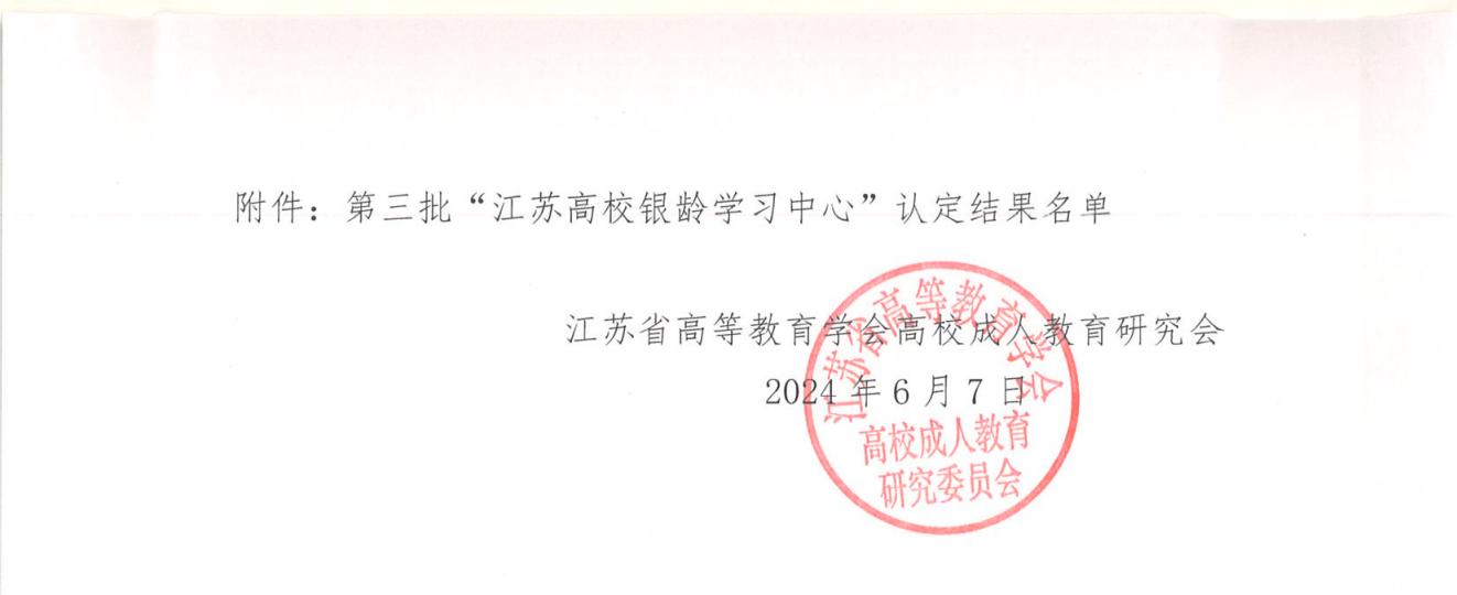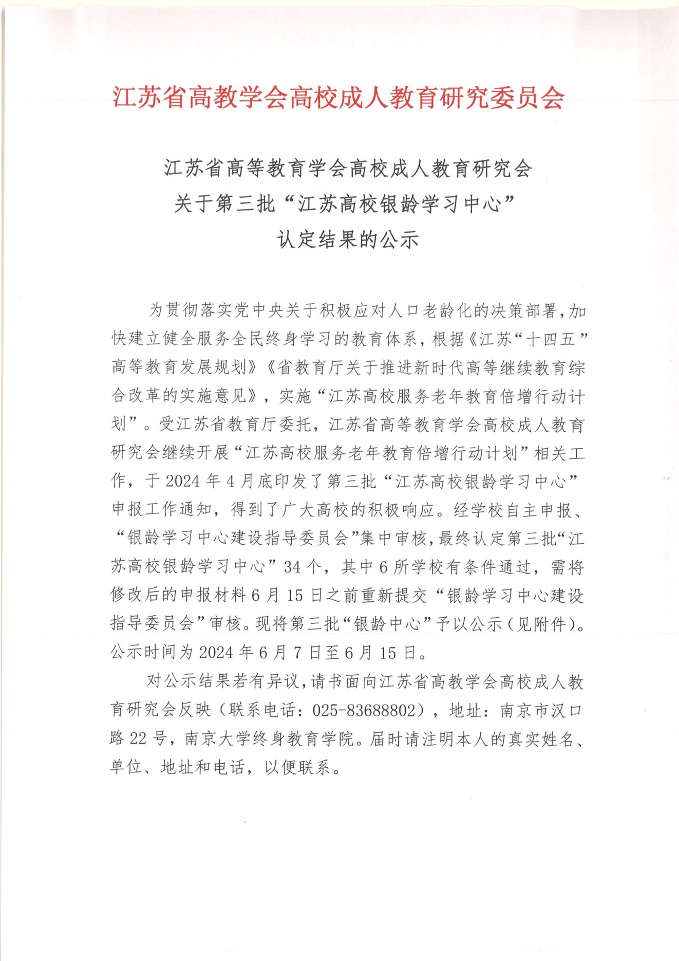 6月7日,江苏省高等教育学会高校成人教育研究会发布第三批“江苏高校银龄学习中心”认定结果的公示,36365位列其中。