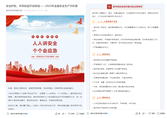 安全生产月期间,图书馆充分发挥宣传阵地作用,通过馆内电子大屏循环播放“人人讲安全、个个会应急”主题标语,以高频次、广覆盖的传播形式强化师生安全意识。同时,依托微信公众号平台推出“人人讲安全、个个会应急——2025年安全生产月知识宣传”专题宣传报道,系统普及交通安全、自然灾害防范、家用电器安全使用等知识,助力营造全社会共同关注安全、参与安全维护的良好风尚。
