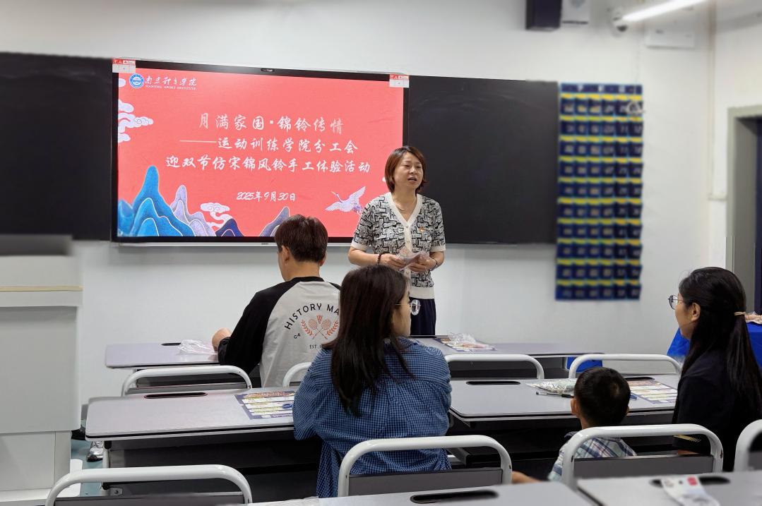 为迎接国庆与中秋双节到来,丰富教职工课余生活,传承中华优秀传统文化,9月30日下午,运动训练学院分工会精心组织了“月满家国•锦铃传情”迎国庆、庆中秋仿宋锦风铃手工体验活动,学院教职工积极参与,在巧手创作中感受双节氛围与非遗魅力。