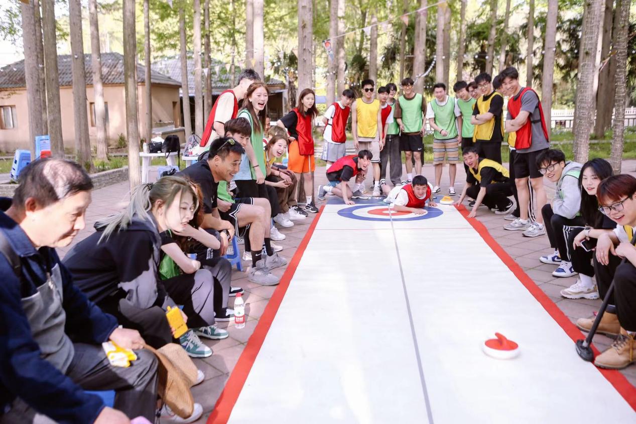 本次拓展活动项目分为“速度与激情”“飞盘运动”和“旱地冰壶”三项。“速度与激情”项目由每个队在最短的时间内,通过连续完成一系列高度协作性项目,参与的同学们彼此之间全力配合。到了“飞盘运动”项目,每组参赛的同学全神贯注、全力以赴完成飞盘接力、空中传递、飞盘掷准等一系列动作,飞盘在空中呈现出完美的弧线轨迹,集观赏性与竞技性为一体,大家享受着这项运动带来的活力与快乐。“旱地冰壶”中,同学们聚精会神,别人上场的时候仔细观察、摩拳擦掌,轮到自己便摆出一副“大显身手”的架势,体验感极强。