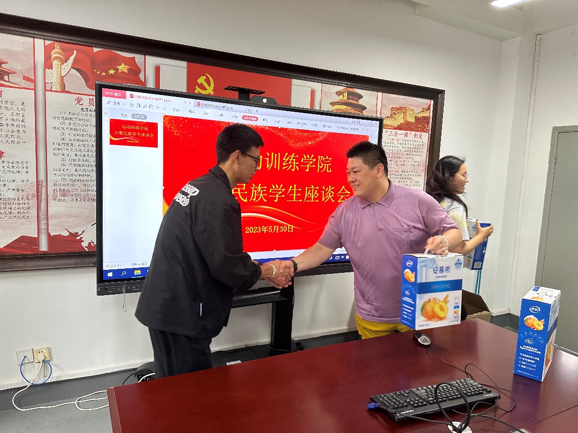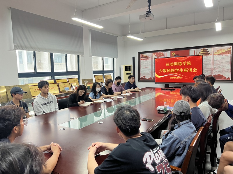 为深入学习贯彻党的二十大精神,认真学习习近平总书记关于加强和改进民族工作的重要论述,全面落实学校及学院关于民族工作的会议精神,为进一步提升少数民族学生教育、管理和服务工作,促进民族团结融合,5月30日12:30运动训练学院在仙林校区315会议室召开少数民族学生座谈会。学院党总支书记葛见珠、党总支副书记杨蓉、资产经营公司代表许辉、学工办副主任孙苏扬、辅导员刘宸及学院2020-2020级少数民族学生参加会议。会议由孙苏扬主持。